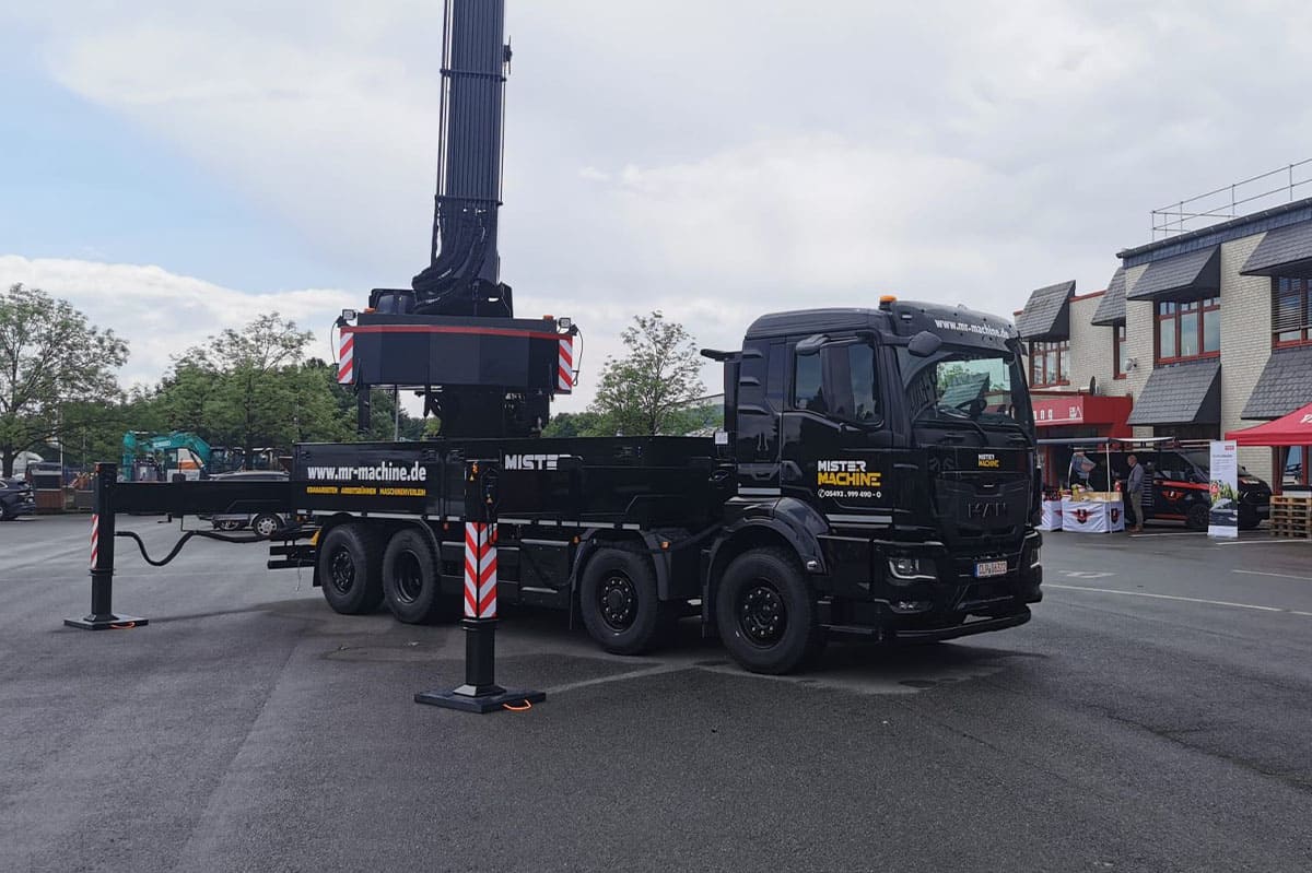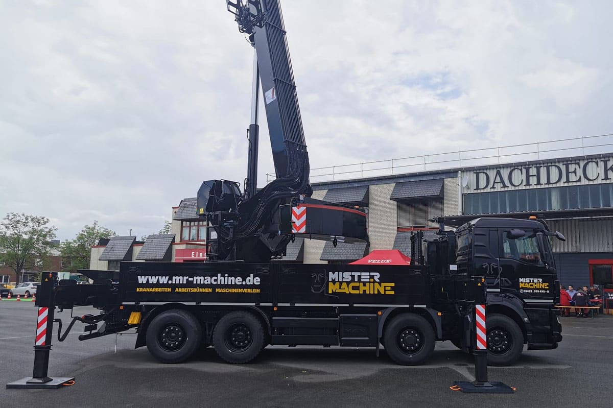Der MKG Langarmkran HMK 1092 SHP TA2-A3 montiert auf einem MAN 4-Achs-Fahrgestell ist der Allround-Kran schlechthin. Der Multifunktionskran besticht durch eine Vielzahl an Einsatzmöglichkeiten: ob mit Vakuummontagegerät für Dacharbeiten oder einem Haken zum Heben von schweren Lasten.